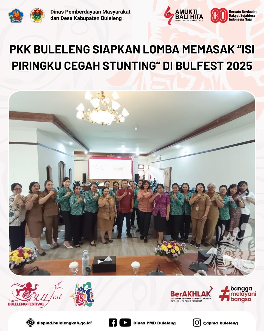 Buleleng, 11 Agustus 2025 - Menyambut gelaran Buleleng Festival (Bulfest) 2025, Tim Penggerak Pemberdayaan dan Kesejahteraan Keluarga (TP PKK) Kabupaten Buleleng akan mengadakan Lomba Memasak dengan tema “Isi Piringku Cegah Stunting”. Kegiatan ini secara resmi diumumkan oleh Ketua TP PKK Kabupaten Buleleng, Ny. Ida Ayu Wardhani Sutjidra, didampingi Sekretaris TP PKK Kabupaten Buleleng, Ny. Made Hermawati Supriatna, saat membuka technical meeting di Ruang Rapat Rumah Jabatan Bupati Buleleng, Senin (11/8).